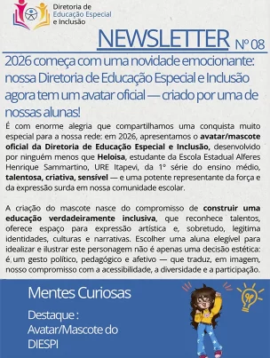 É com enorme alegria que compartilhamos uma conquista muito especial para a nossa rede: em 2026, apresentamos o avatar/mascote oficial da Diretoria de Educação Especial e Inclusão, desenvolvido por ninguém menos que Heloisa, estudante da Escola Estadual Alferes Henrique Sammartino, URE Itapevi, da 1º série do ensino médio, talentosa, criativa, sensível - e uma potente representante da força e da expressão surda em nossa comunidade escolar.