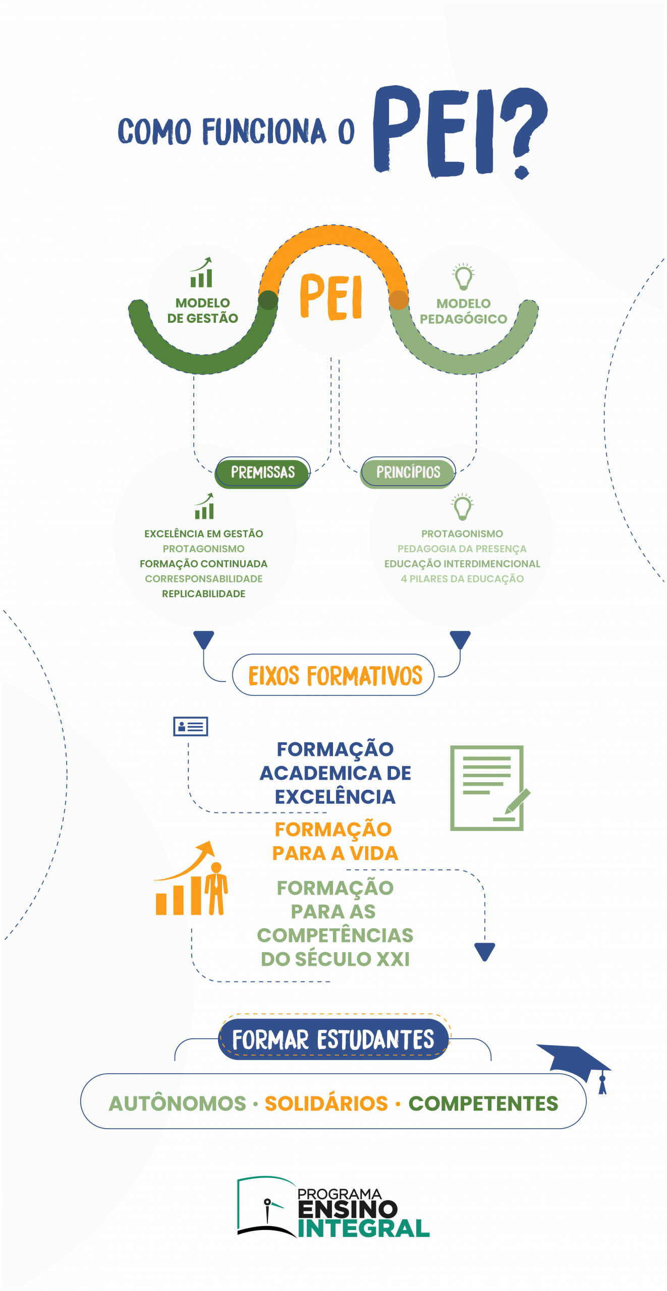 Ele está fundamentado em Princípios e Premissas que subsidiam o planejamento e o desenvolvimento das ações nas escolas que integram o PEI, visando à formação de estudantes autônomos, solidários e competentes.
