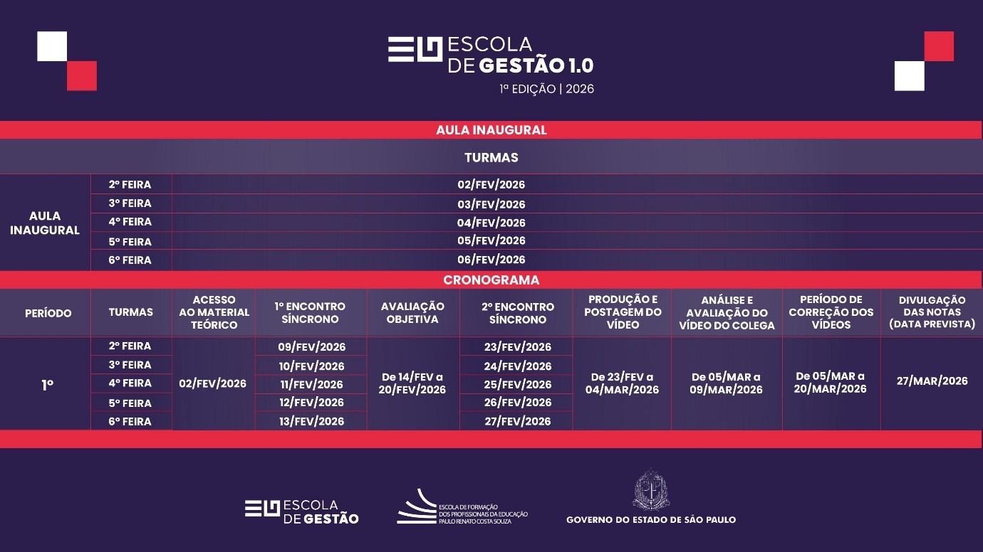 O curso Escola de Gestão 1.0 – 1ª Edição/2026 terá início no dia 2 de fevereiro de 2026. A formação foi pensada para ampliar saberes e práticas de gestão escolar, contribuindo para o desenvolvimento profissional e o fortalecimento da liderança na rede.