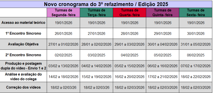 A seguir, apresentamos o cronograma do 3º refazimento, conforme a turma.